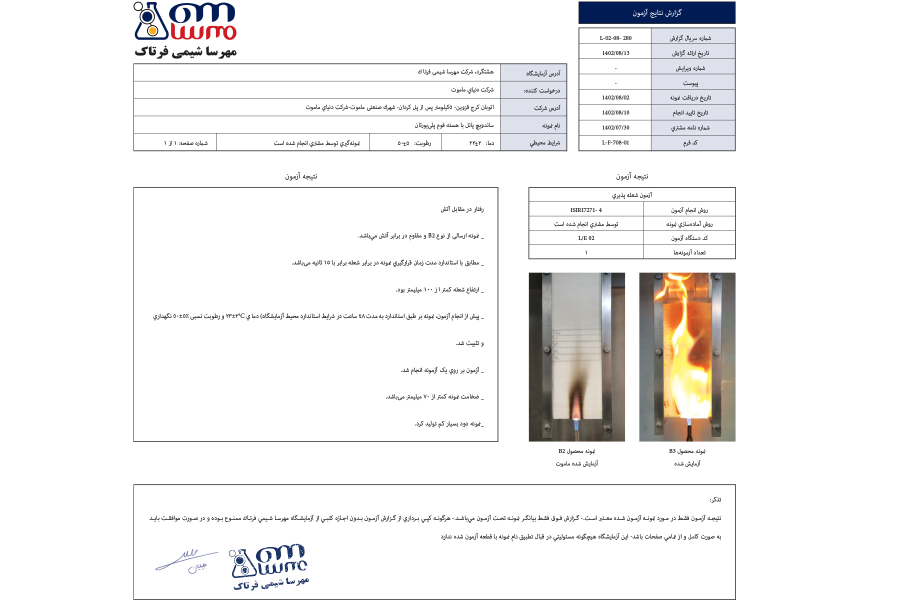 Используемые в сэндвич-панелях компании Сазехе Пушеш Маммут пены после прохождения различных этапов проверки стандартов получили сертификат, подтверждающий результаты соответствующих испытаний.